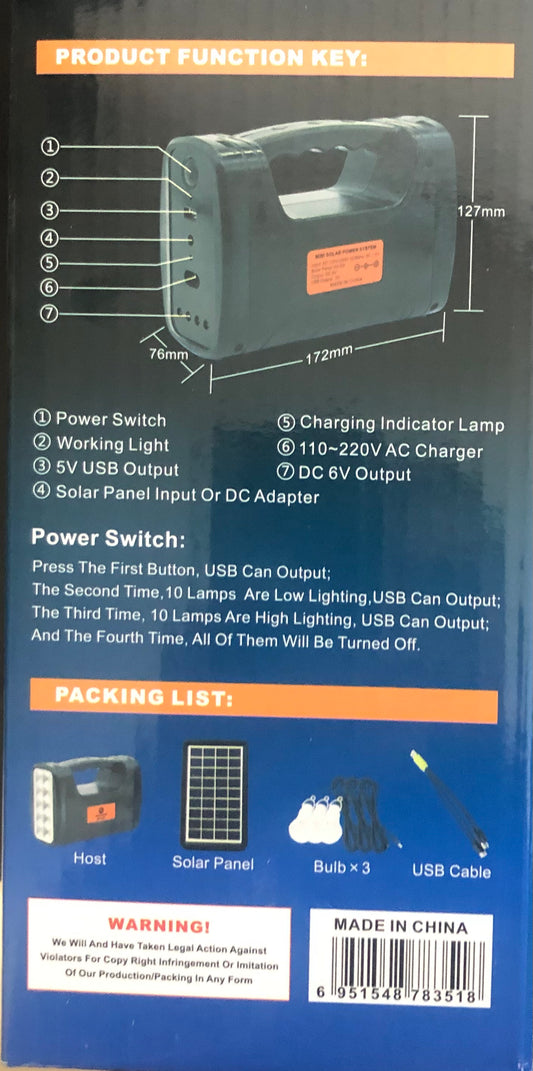 סוללת גיבוי עם מערכת תאורה ניידת דגם EP-393 עם טעינה סולארית, טעינה חשמלית רמקול רדיו ומטען נייד חיבור USB 5V